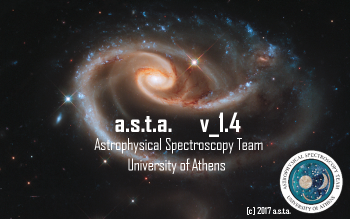As for ASTA software, the first approach was made by Prof. George Danezis (UCL) when he was an undergraduate student in Cambridge University. The name of the first software was 'Spectrum'. The second and more advanced approach was developed by Dr. D. Nikolaidis and it was called DMVL. DMVL is the one we used until recently. The latest software release, which is called A.S.T.A. (Astrophysical Spectroscopy Team of Athens) is designed and developed by Dr. Dimitrios Tzimeas with the help of PhD student Dimitrios Stathopoulos and the theoretical contribution ofDr. Evangelia Lyratzi, Dr. Antonios Antoniou and Dr. Emm. Danezis. Since 1984 our scientific team published 131 research papers in international peer reviewed journals and conference proceedings.